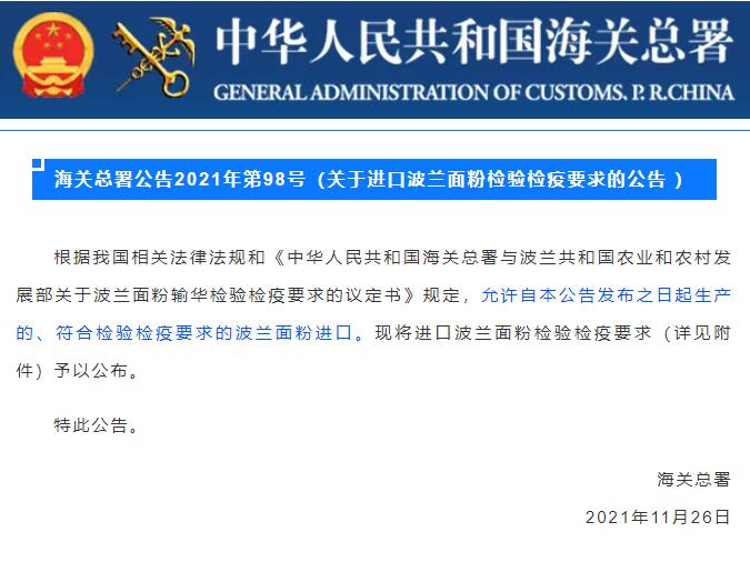 2021年11月26日,海關(guān)總署公布2021年第98號公告:允許自本公告發(fā)布之日起生產(chǎn)的、符合檢驗檢疫要求的波蘭面粉進口。