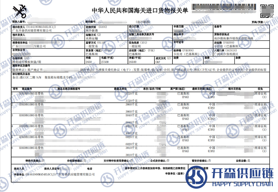 【本文結(jié)語】 上述就是巴基斯坦凍帶魚進口報關(guān)清關(guān)代理服務【經(jīng)典案例】的全部內(nèi)容,希望能對您有所幫助,如有水產(chǎn)品進口報關(guān)上任何疑問及問題可隨時在線聯(lián)系我們或撥打 18002611553,開森供應鏈擁有豐富的水產(chǎn)品進口報關(guān)操作經(jīng)驗及案例,10余年進口經(jīng)驗為您所用,各類進口疑難都能為您一一解答及協(xié)助快速處理解決!