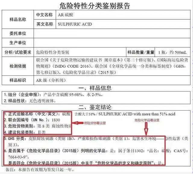 但上述條目繁雜,有時難以把握,可以向有資質(zhì)的機構申請危險特性鑒別報告,同時鑒別危險貨物種類和危險化學品的危險特性。