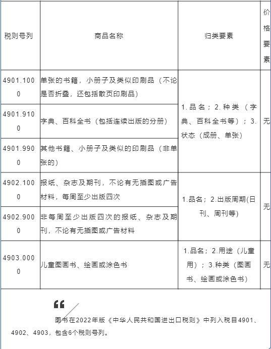 根據(jù)《中華人民共和國海關(guān)進出口商品規(guī)范申報目錄及釋義(2022)》的規(guī)定,企業(yè)申報進口圖書應明確申報以下要素:(如下表)