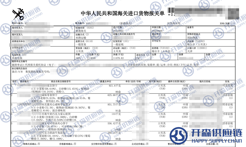 【本文結語】 上述就是天津港土耳其餅干進口報關代理服務【清關案例】的全部內容,希望能對您有所幫助,如有餅干進口報關上任何疑問及問題可隨時在線聯系我們或撥打 18002611553,開森供應鏈擁有豐富的餅干進口報關操作經驗及案例,10余年進口經驗為您所用,各類進口疑難都能為您一一解答及協助快速處理解決!